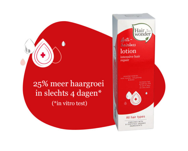 Onze Hairwonder Anti-hairloss lotion is een bijzonder krachtig product dat de haargroei met 25% laat toenemen in slechts 4 dagen (*in vitro test) en haaruitval vermindert. Een bewezen werking dus.
